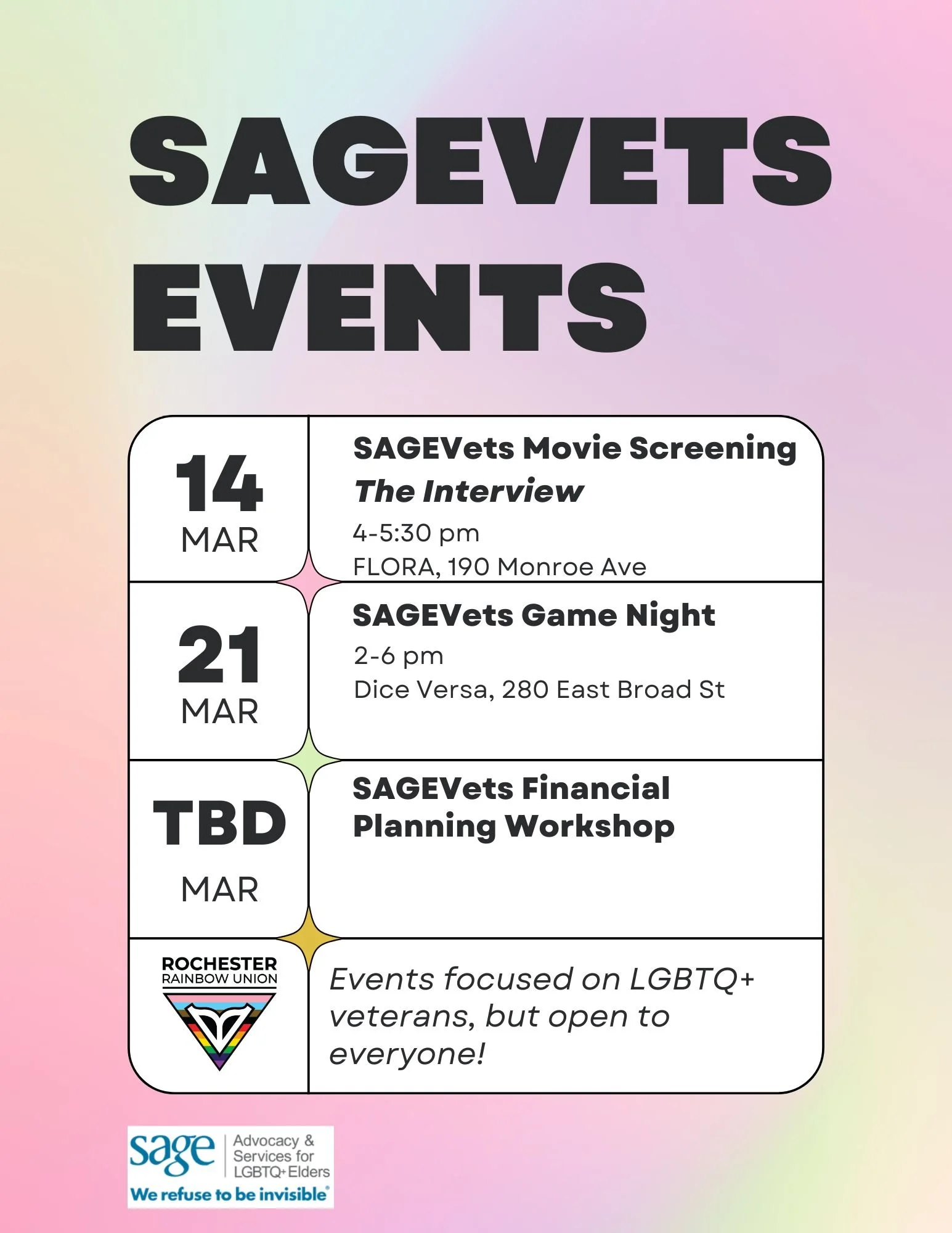 We’re tentatively planning a SAGEVets board game drop-in at Dice Versa on Saturday, March 21st from 2-6 pm. We’ll have free snacks available! Save the date and keep an eye out for more information! This event is geared toward LGBTQ+ veterans but open to everyone.